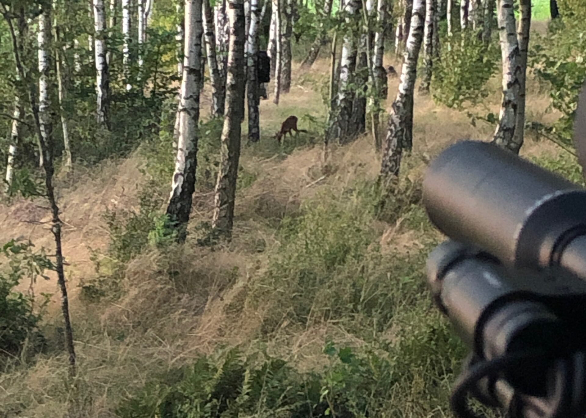 30 minutter før solnedgang, ser jeg pluselig ryggen af et vildsvin inde i skoven. Den bevæger sig desværre væk fra mig, og kommer ikke på sikker skudhold. Øv.