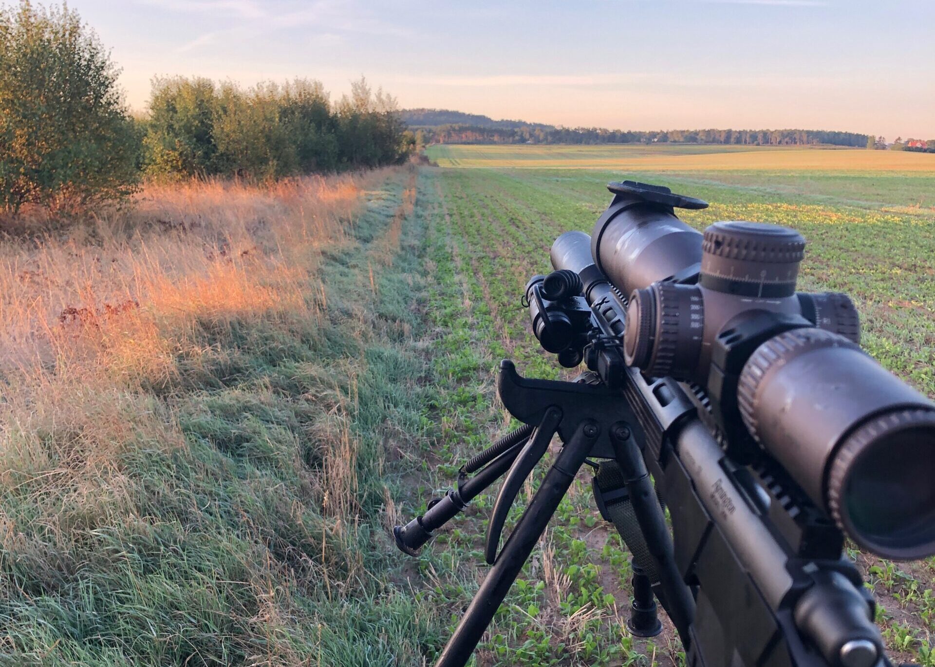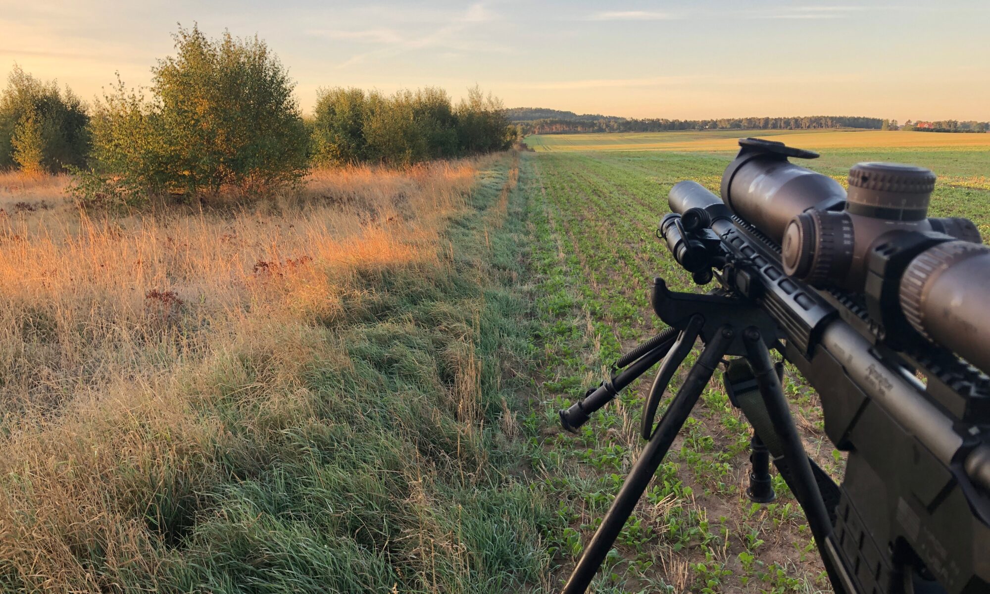Jeg går noget længere væk, for at prøve et andet sted. Der er ikke noget tårn eller stige, så jeg stiller min skydestok op, og så er det ellers bare med at nyde solopgangen og forhåbentligt se en buk eller andet vildt.