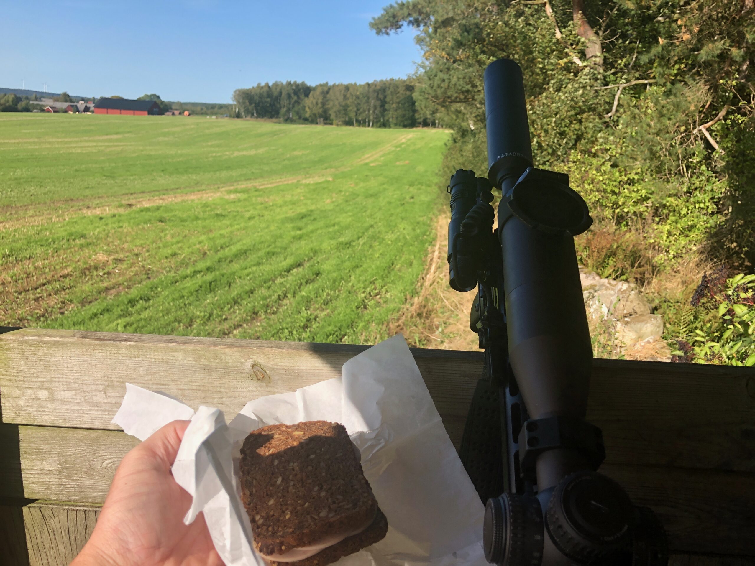 Ved tre tiden, beslutter jeg mig for at spise min madpakke. Der er ingen af os der har set vildt, men vi har set frisk spor efter vildsvin der har rodet i jorden om natten, så vi ved at de er her.