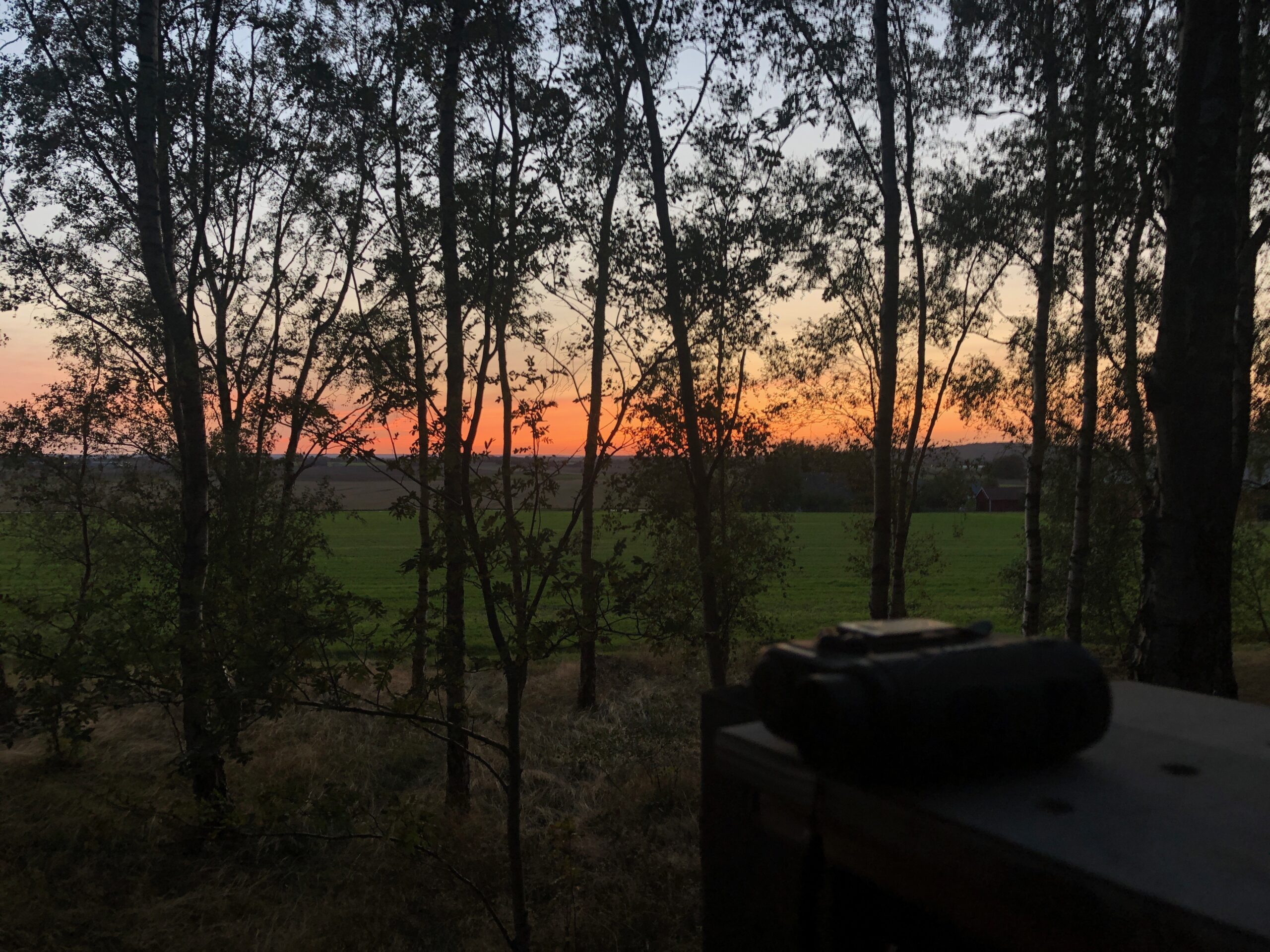 Ved solnedgang har vi ikke set eller hørt andet mere, men vi vælger alligevel at blive siddende, næsten til kl. 23. Vi er godt klar over at chancen for vildsvin nok er størst om natten, men der er bælg ravende mørkt efter kl 2030, så vi formoder at vildsvinene også kan finde på at komme frem på det tidspunkt.