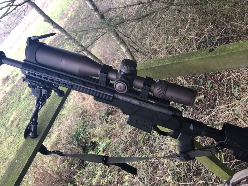 Lige før den når det åbne stykke afsikrer jeg riflen og sørger for min tommelfinger ligger på højre side af pistolgrebet så jeg er mest mulig afslappet i hånden. Geværet's bipod hviler på rammen af stigen og det er totalt stabilt og afslappet.