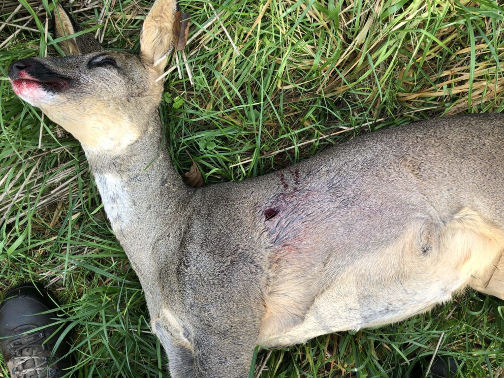 Råyret springer op og skyder ryg. Et godt tegn på at det er ramt på bladet. Det falder sammen og jeg kan se det bevæger sig mod højre, henimod de to andre rådyr. Jeg genlader med det samme og følger det et par meter. De to andre kigger forvirret rundt og løber så mod højre.