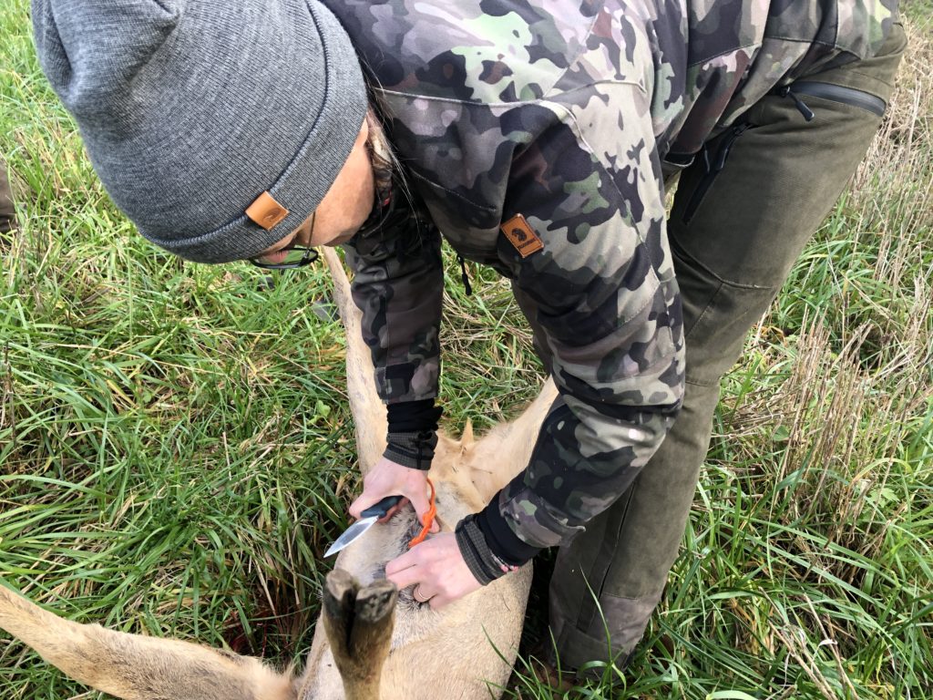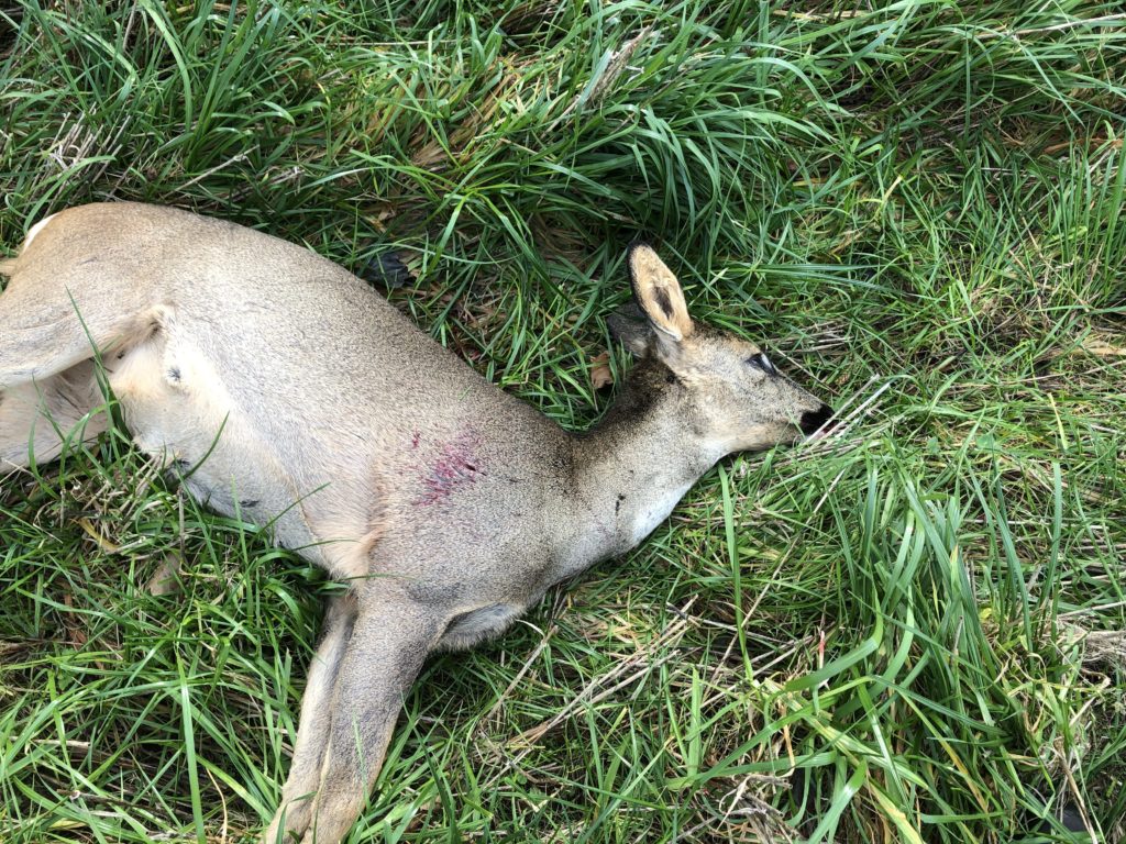 Vi får trukket råen ud på græsset. Hun er tung. Jeg kan se skuddet sidder nøjagtigt hvor jeg sigtede og hun har ikke haft en chance.
